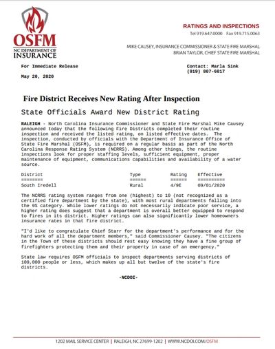 Fire Chief Jerry Starr and the membership of South Iredell Fire-Rescue are proud to announce the lowering of our fire suppression rating. Effective 9/1/2020, the rating for properties within the South Iredell Fire district will reflect an ISO Class 4 rating. These inspections are required on a regular basis as part of the North Carolina Response Rating System (NCRRS) Things such as proper staffing levels, sufficient equipment, proper maintenance of equipment, communication capabilities, and availability of a water source are what directly affects rating changes. The higher rating South Iredell received indicates that overall we are better equipped to respond to fires within our district. Your homeowners insurance rates should benefit from this new rating. If you haven't seen a premium adjustment contact your insurance company and make them aware of the new rating immediately. If you have questions or are unsure if your property is in our fire district feel free to contact us.